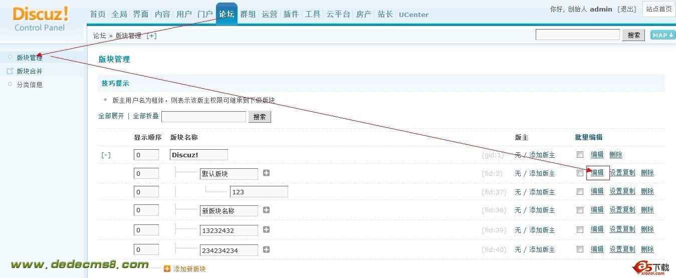 一、后台 论坛 板块 编辑(这里您想设置那个板块的主题分类,那么您直接点击这个板块后面的编辑)