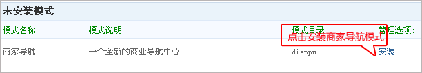 模式设置中自动生成商家导航,此时的商家导 航 模 式 为 未 安 装 模 式,点击安装,轻松完成安装。
