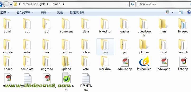 Upload 文件夹存放的是DirCMS的全部程序文件。安装DirCMS时 ,需要将该文件夹下的所有文件上传到网站根目录。如图: