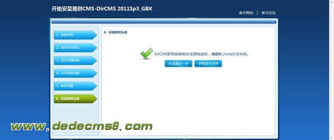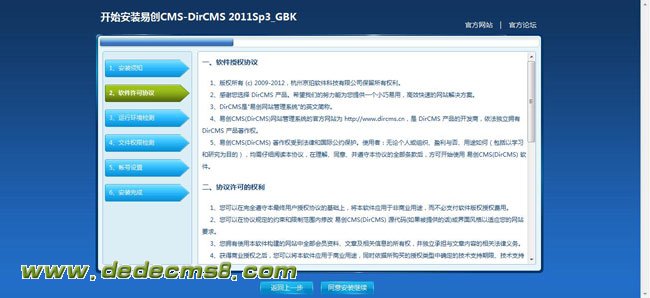 这一步主要描述DirCMS的版权信息,建议大家在使用DirCMS的过程中,尊重我们的劳动果实,不要擅自去除版权信息,算是对我们的支持啦。