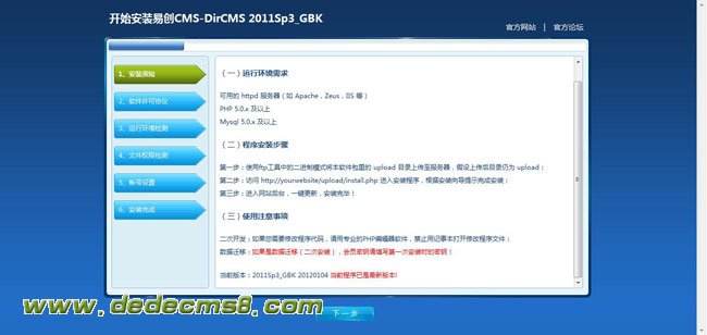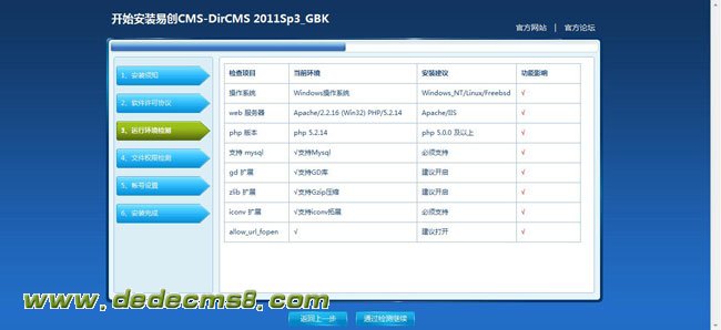 这一步是描述安装DirCMS所需的服务器环境,一般情况下是没问题的。