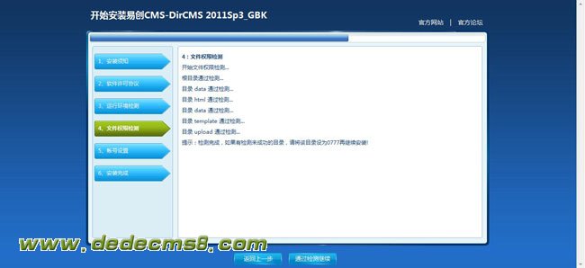 这个步骤主要是对DirCMS运行所需的目录权限检查,在安装DirCMS的时候,所检测的文件夹必须具有可读可写可修改(0777)属性,否则即使安装完毕,DirCMS系统也不能正常使用。