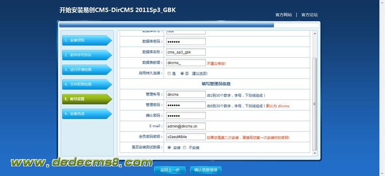 - 填写管理员信息指的是DirCMS安装后的网站管理员账号和密码信息,填写后请牢记。
