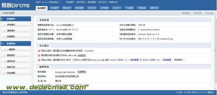 然后依次点击左侧菜单栏的 更新缓存,更新栏目即可完全完成DirCMS的安装。至此,DirCMS安装完毕。