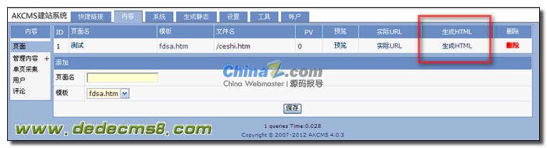后台->内容管理->管理页面,选择具体的页面,点击"生成静态页"链接,正常情况下提示"该操作执行成功"。另外,在修改保存页面的时候,系统会自动生成静态页。