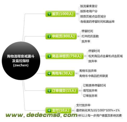 在将流量通过入站来源和站内流量细分后,就应该开始关注其购买衰减率了,即每一步的放弃率,找出其核心影响因素。比如购物车的放弃率达到了45%,是因为注册阻力还是因为只是将购物车作为比价工具呢?对于一次购买10本图书的用户,真正有意义的,是比较各购书网站的购物车价格,而不是单本书。这就要看放弃购物车的用户,有多少点击过“去收银台”,因为点击“去收银台”后就有一个巨大阻力:需要注册。这就需要监控点击“去收银台”的流量了。