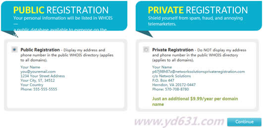 第四步,默认不选择,如果你需要隐私保护,那就选择右边的,9.99美元一年,我不需要隐私保护,那就默认点击,continue按钮继续。