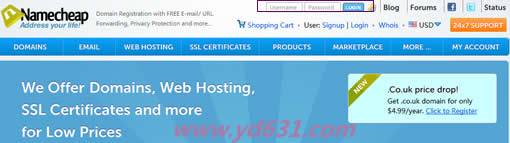 第一步,登录NameCheap官网地址,看到首页顶部的用户登录框。