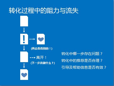最后,我们来看下转化分析。转化渠道与前面的页面导航很像,区别在于转化渠道通常是一个目标非常明确的封闭渠道。在这个渠道中我们希望访问者一路向前,不要回头也不要离开,直到完成转化目标。对于转化渠道,我们主要进行两部分的分析,分别是访问者的流失和迷失。下面先来看第一部分:转化过程中的阻力的流失。转化的阻力是造成访问者流失的主要原因之一。这里的阻力包括错误的设计和错误的引导。