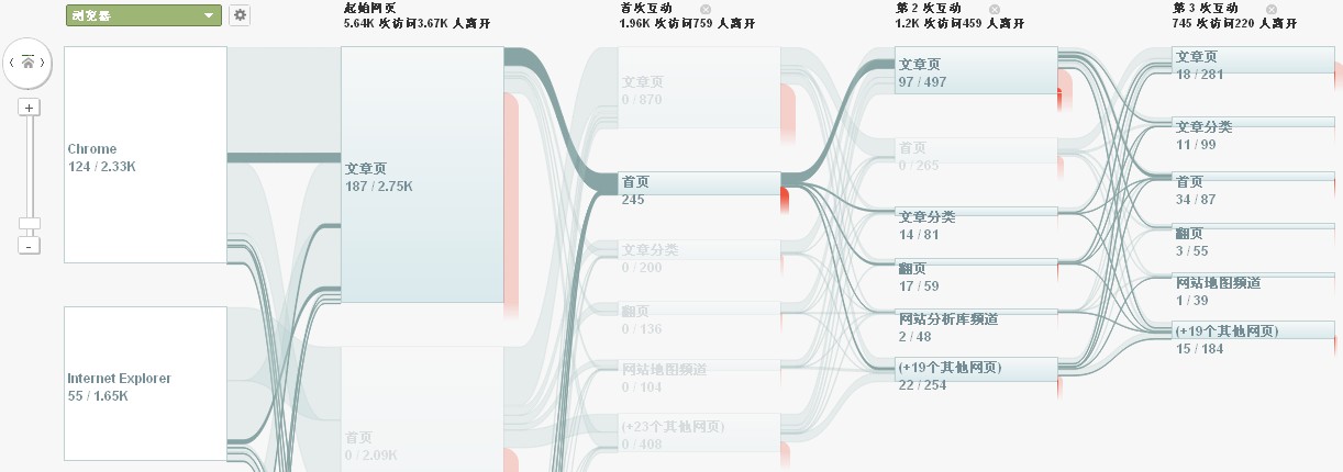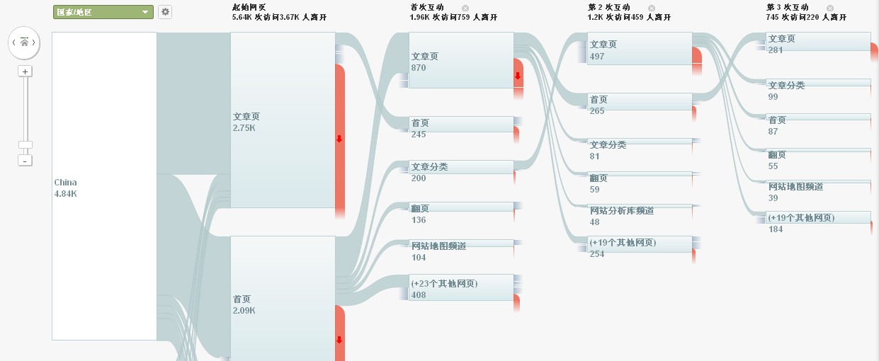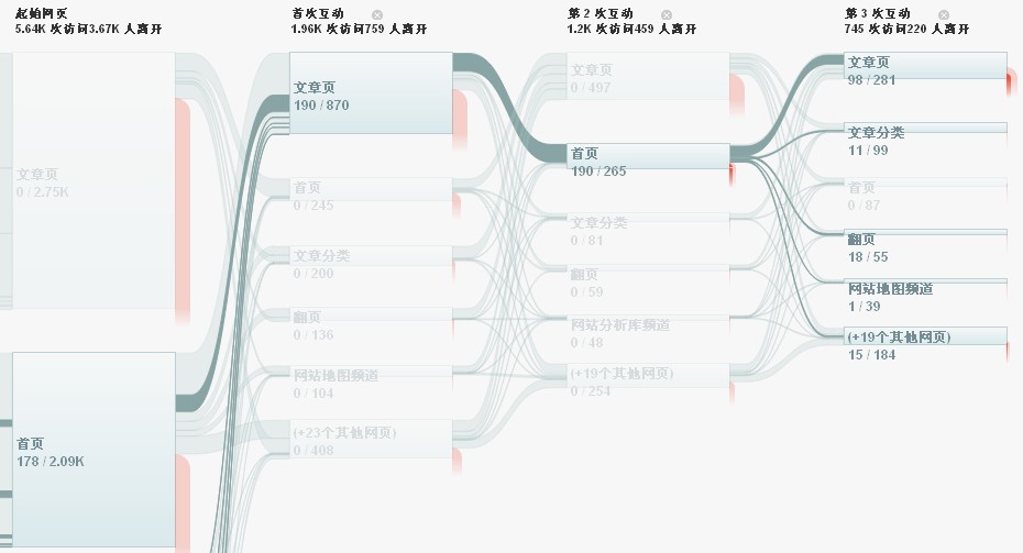 在第三种模式中,我选择了从文章页进入网站首页的这部分流量,很明显,这部分访问者中大部分从首页继续进入了新的文章页,少部分选择了其他的导航方式。通过三种查看模式,基本可以确定文章页现有的相关文章功能存在问题,同时文章页中也缺乏其他的导航方式。下一步需要对文章页底部的推荐规则进行调整,并在右侧增加文章类别的导航。
