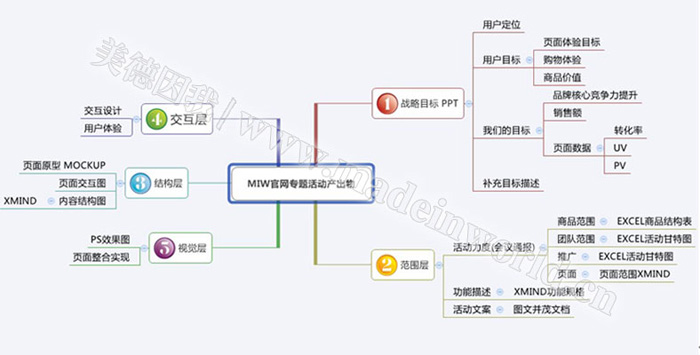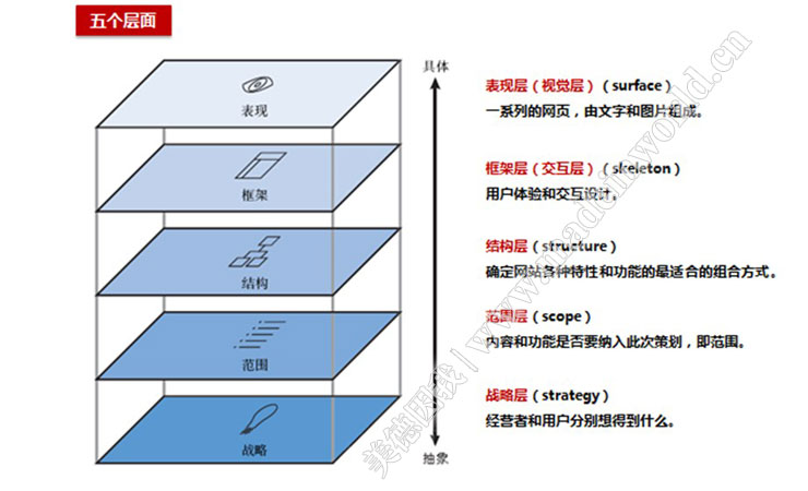 任何的策划必须以用户为中心,满足用户的需求,超越用户的期望。先来介绍这五个要素:战略层、范围层、结构层、框架层、表现层。