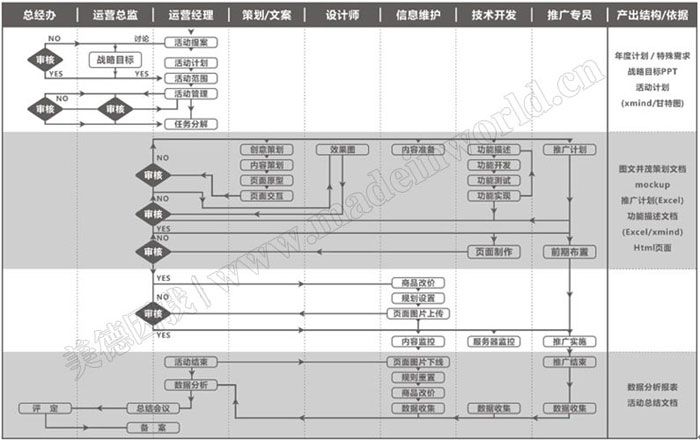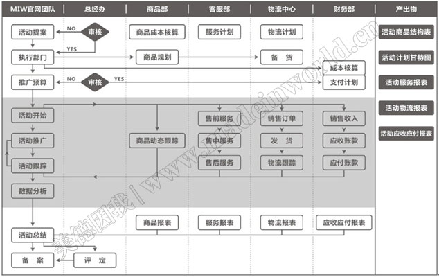 公司岗位设置和发展阶段不同,流程必然存在极大的差异,但所谓形散神不散,岗位流程不管如何变化,其核心都可以归结为这五个层面。上述流程以部门为 节点,图3为MIW官网运营团队内部流程,图4为其他部门协同流程,那么大家会问,各个岗位的内部流程呢?那么大家请仔细看图,各个岗位从上到下都有箭 头,这个正是各个岗位的内部流程。