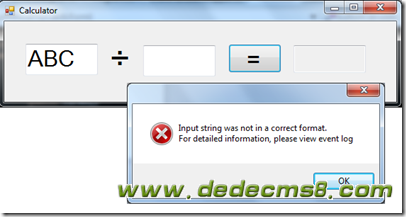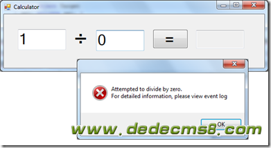 代码非常简单,需要注意的是在对Button的Click事件进行注册的时候,我们直接使用的时我们上面创建的 EventHandlerWrapper,这和真正进行事件注册的方式几乎一致。当你输入非数字或者被除数设置为的时候,会抛出异常,异常的相关信息会直接写入EventLog,并将异常消息通过MessageBox显示出来,如下图所示: