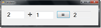 EventHandlerWrapper 通过EventHandler对象创建,并将EventHandler的Target和Method赋值给EventHandlerWrapper的同名属性。此外,EventHandlerWrapper得Invoke方法中,将对Method的调用放在一个Try/Catch中,并对捕获的异常进行简单的处理:记录到EventLog中在通过MessageBox将相关异常信息显示出来。而EventHandlerWrapper的Handler属性就是对该Invoke方法的直接反映。最后定义了一个隐式类型转换将EventHandlerWrapper直接转换成EventHandler。转化后返回的就是反映Invoke方法的Handler属性。为了演示,我写了一个简单的计算器的应用。该应用运行后的界面如右图所示,这是一个进行简单除法运算的计算器。 下面是相关的代码: