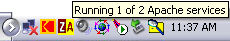 有人也许想知道为什么会显示 “running 1 out of 2 apache services”,那是因为你可能有不止一个版本的apache在工作。大多数人不会这么干,但我的机器上的确有两个 apache 服务器。我的 1.3.27 停止运行了,而 apache 2 则正在运行中。下图是我的机器的情况: