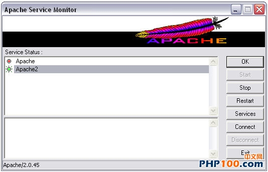 注意,在apache1.3.27 的监视器上有个红灯,而在apache2的上面有个绿灯。第一次安装 apache 的人只能看见一个,因为你只装了一个。
