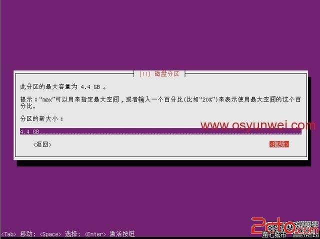 分区大小,这里默认显示剩余空间(分区之前先要规划好,我这里只分swap和跟分区"/"),所以剩余空间全部给“/”分区,点继续