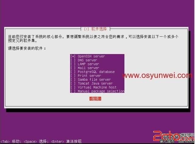 用空格选择第一项:OpenSSH server 点继续(服务器根据自己需求。其它软件后面再安装)