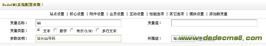 输入新变量相关信息,这里变量名称输入“QQ”,变量值留空,参数说明为:站长QQ,所属组为“站点设置”。完成后,点击“保存变量”按钮即可,如下图。