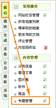 我们以超级管理员身份登陆后台,在系统的[核心]-[专题管理]中对专题进行管理。