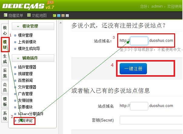 【第二步】在DedeCMS后台上传多说模块,请根据自己Dede的类型选择GBK和UTF-8版本,进入第一步得到的GBK或UTF-8版本后,选择唯一的文件上传。