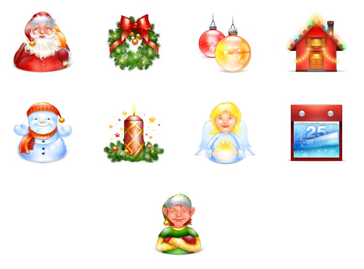 此专辑共含9张尺寸为128x128像素的圣诞节和新年PNG图标素材。