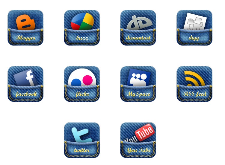 此专辑共含10张尺寸为128x128像素的牛仔裤风格社交PNG图标素材。
