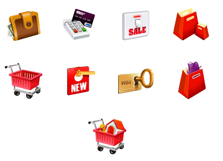 此专辑共含9张尺寸为128x128像素的红色电子商务PNG图标素材。