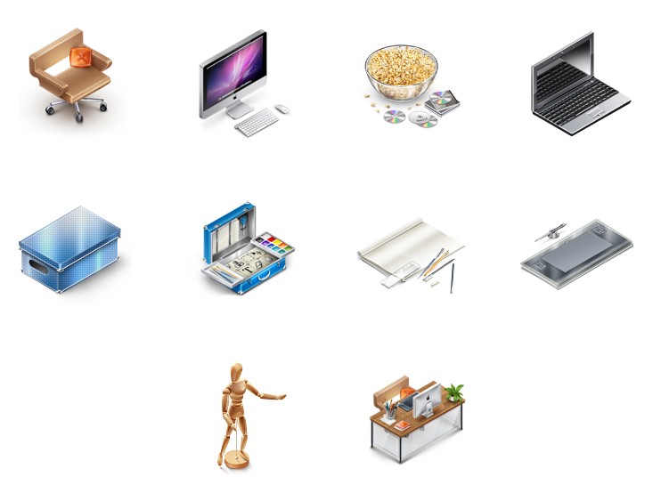 此专辑共含10张尺寸为128x128像素的现代办公室PNG图标素材。