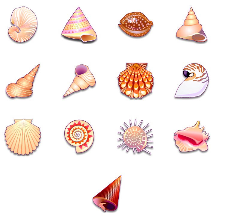 此专辑共含13张尺寸为128x128像素的漂亮的贝壳PNG图标素材。