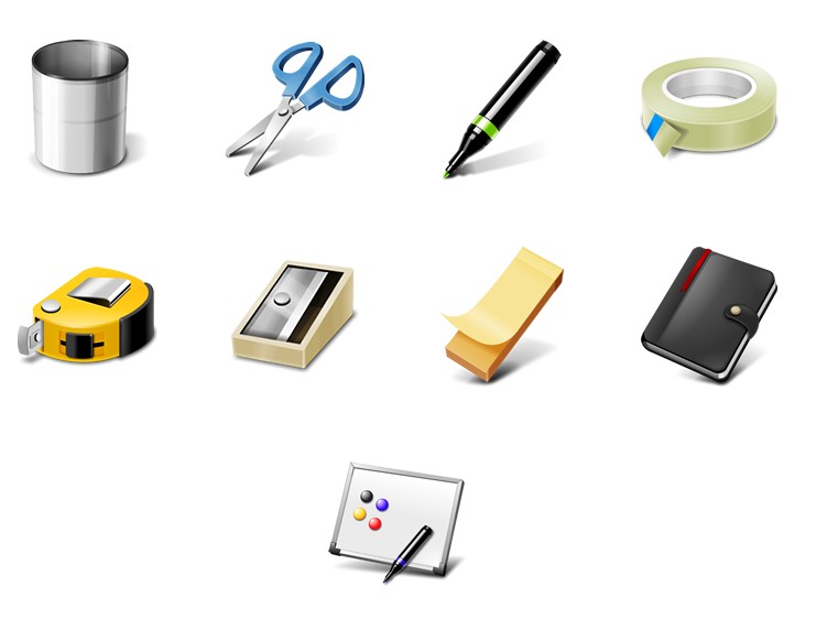 此专辑共含9张尺寸为128x128像素的常见办公用品PNG图标素材。