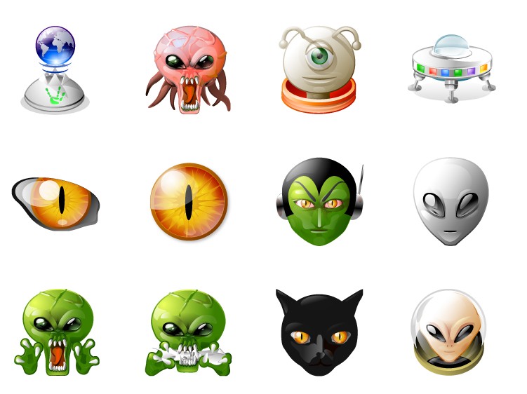 此专辑共含12张尺寸为128x128像素的可爱外星人形象PNG图标素材。