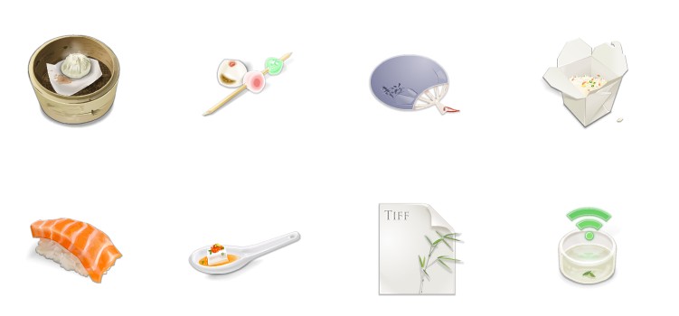 此专辑共含8张尺寸为128x128像素的古典中国风烹饪食物PNG图标素材。