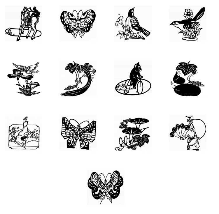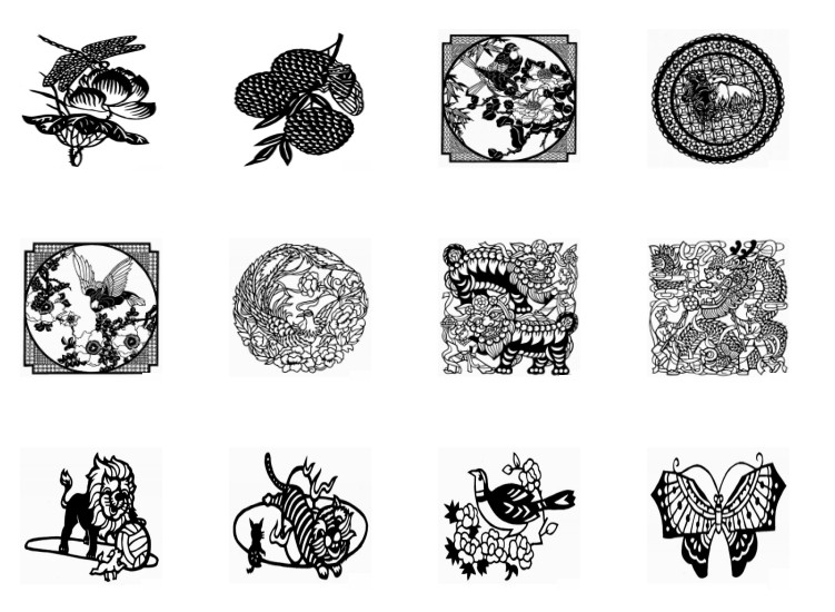 此专辑共含25张尺寸为128x128像素的黑白中国剪纸艺术PNG图标素材。
