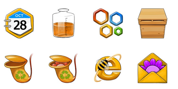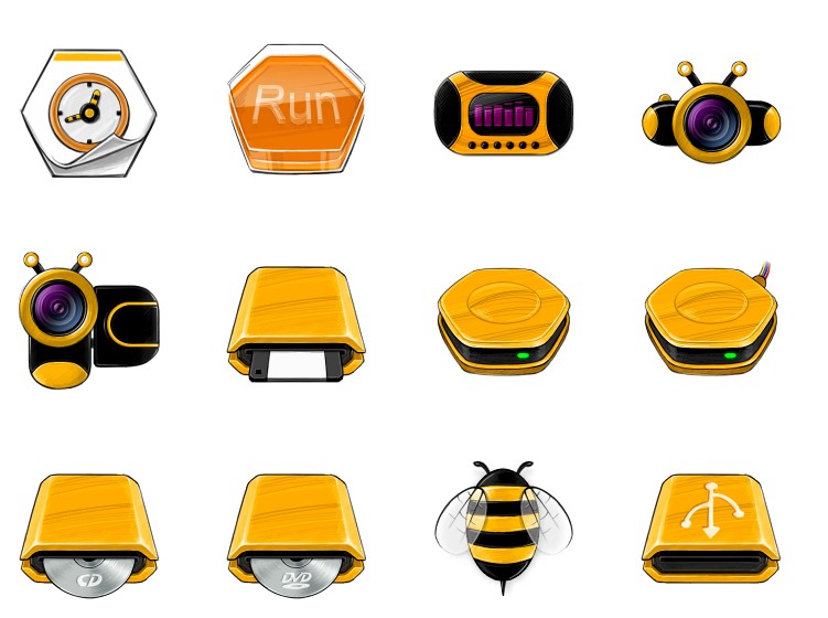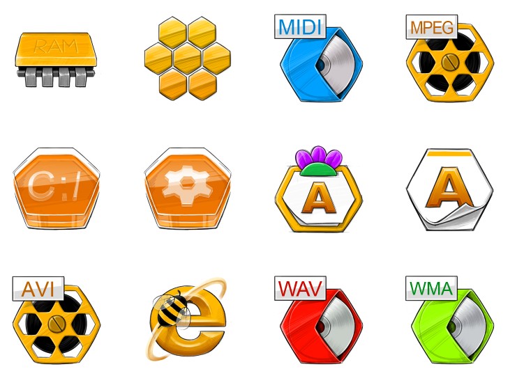 此专辑共含32张尺寸为128x128像素的蜜蜂和蜂巢样式系统文件PNG图标素材。