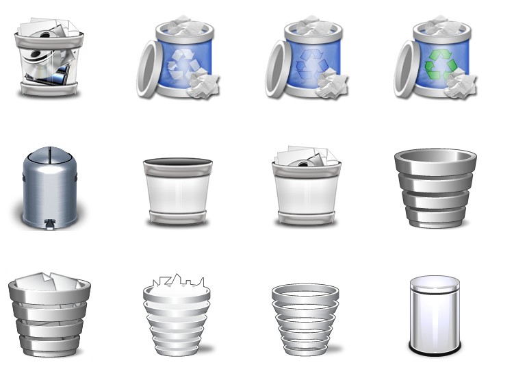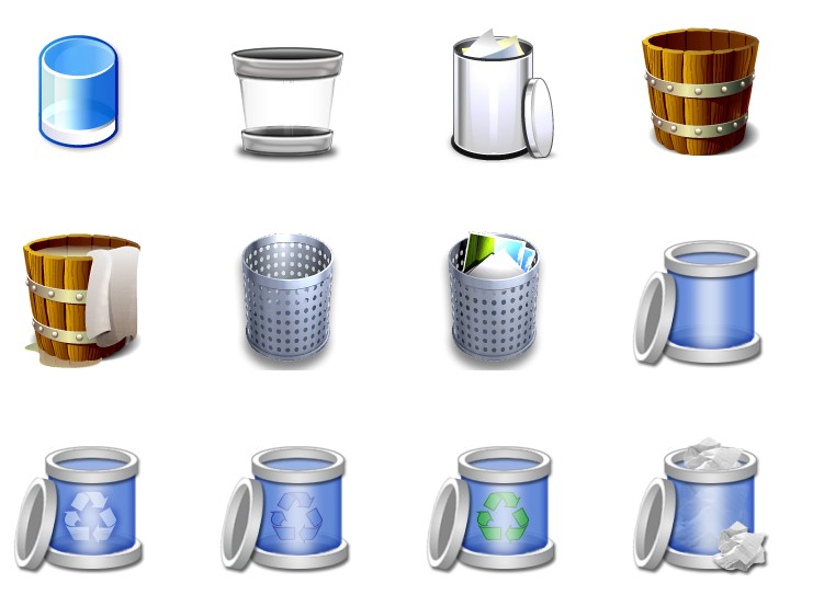此专辑共含24张尺寸为128x128像素的多种透明垃圾桶PNG图标素材。