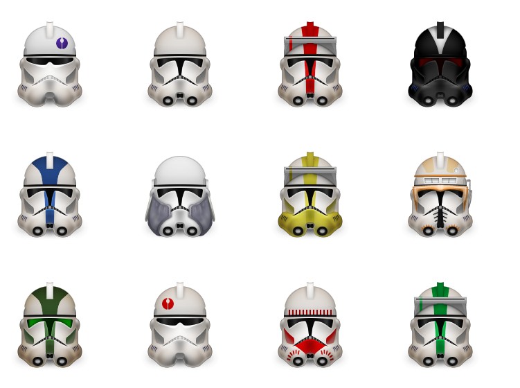 此专辑共含12张尺寸为128x128像素的星战士兵头盔全集PNG图标素材。
