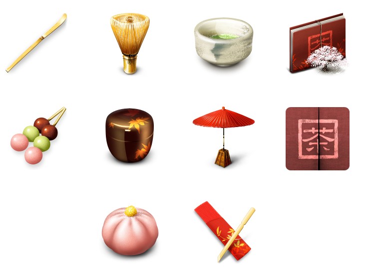 此专辑共含10张尺寸为128x128像素的一组茶具PNG图标素材。