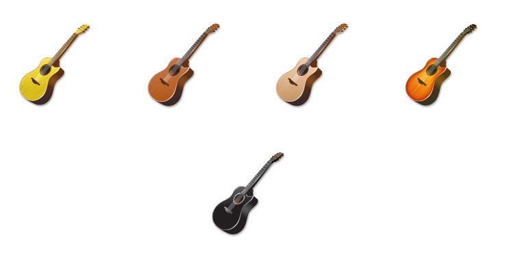 此专辑共含5张尺寸为128x128像素的5把不同颜色的木吉他PNG图标素材。