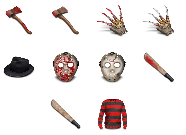 此专辑共含10张尺寸为128x128像素的Freddy vs Jasons惊悚PNG图标素材。