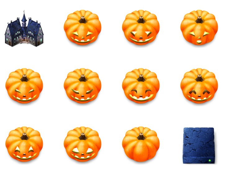 此专辑共含12张尺寸为128x128像素的万圣节南瓜与城堡PNG图标素材。