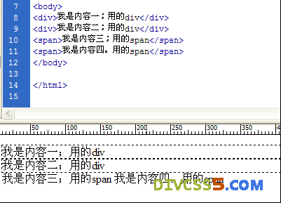 分析:从上图很容易知道“我是内容一;用的div”和“我是内容二;用的div”两个内容外部用的是<div>标签,他们得到样式是占用了一排空间(相当于换行一样);而“我是内容三;用的span”和“我是内容四;用的span”则,文字内容有多宽,就占用多宽距离,使用<span>标签和不使用一样效果。