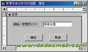 5.一个宏的实例检验口令 在这个实例中将创建一个将包含条件的宏组,用来实现对口令的检验,如果口令正确,就先关闭这个身份核对窗口,再打开另一个窗体;如果口令不正确,将出现信息框要求重新输入口令。 建立一个窗体,添加文本框,命名为管理员口令,用来...