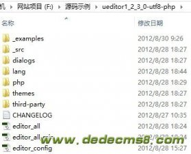 DedeCMS与Ueditor百度编辑器整合图文教程 一、下载UE 最新版本是 1.2.3.0 ,请自己下载PHP版本(本人是PHP版本 UFT-8版)。下载完成后,会得到以下这样的目录结构的 UE文件说明: _examples 是存放示例的文件夹 _src 存放是各功能未压缩的JS源码 dialogs 是...