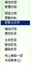 这个方法的作用是当我们使用DEDECMS模板做网站可以投放广告或者增加网站PV的时候可以利用到! 看方法: 第一步:更新JS文件! 方法是。在栏目列表中,右键点击栏目名称,然后选择[获取JS文件] 下一步:选择要调用的栏目名称,不管前面在哪个栏目上点击[获取J...