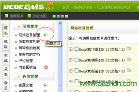 在上一节《 修改DedeCMS后台管理员用户名的三种方法 》教程里,我们学习了如何修改已有的管理员用户名id,这节课开始进入后台操作学习: 1、登陆后台后,在左边的边栏核心菜单下,可以在网站栏目管理右边找到创建栏目的按钮,如下图所示: 图-1 DedeCMS后台...