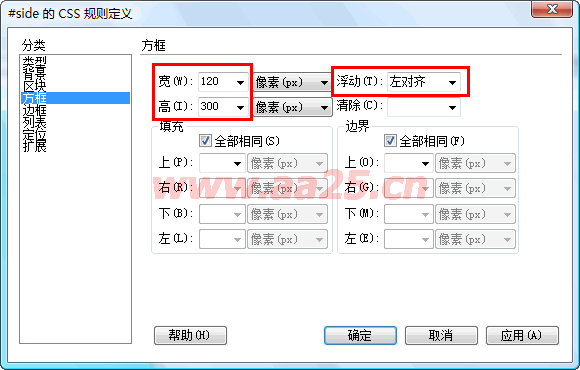 下面以常见的左列固定右列自适应为例,因为div为块状元素,默认情况下占据一行的空间,要想让下面的div跑到右侧,就需要做助css的浮动来实现。首先创建html代码如下: <div id="side">此处显示 id "side" 的内容</div> 按照如图所示的创建方法,把两个div都创建出来,或手工写出代码。div创建完成后,开始创建css样式表,代码如下: #side { background: #99FF99; height: 300px; width: 120px; float: left; }